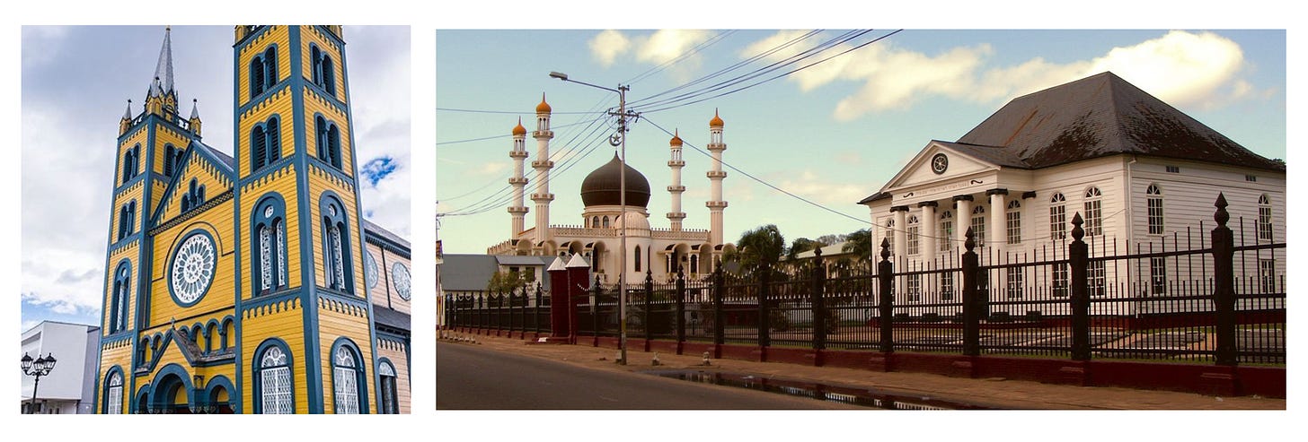 Downtown Paramaribo buzzed with life, sporting exotic sights at every turn. A wooden Gothic Cathedral, yellow and blue, stood tall, boasting an intricate rose window flanked by two towering spires. I saw my first mosque, its minarets like guards protecting a tapered dome. A gleaming white synagogue, faced with white columns atop a contrasting dark bases looked straight out of Roman times, complete with Hebrew inscriptions, like my dad studied on flashcards in seminary.