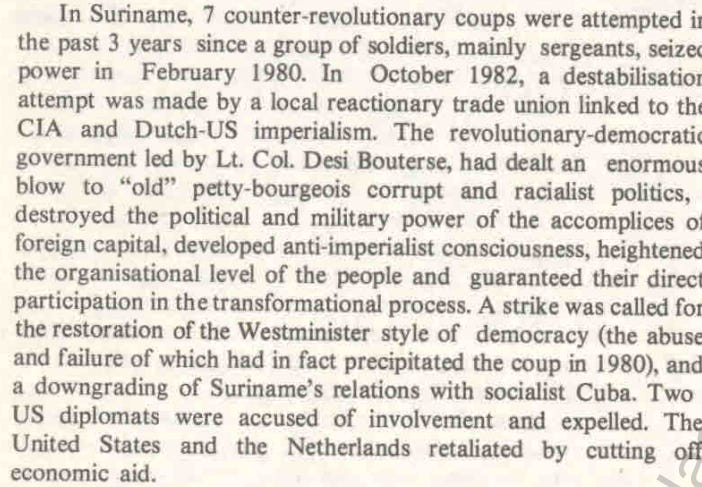 Internal Turmoil Escalates: February 1982: Bouterse ousted President Chin A Sen over Cuban ties. March 1982: Lt. Soerendra Rambocus’s coup attempt failed.