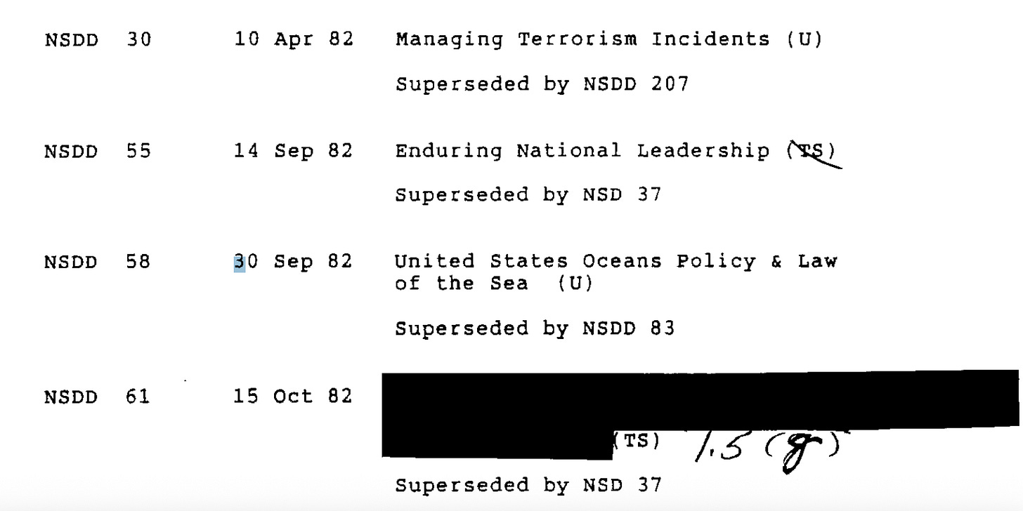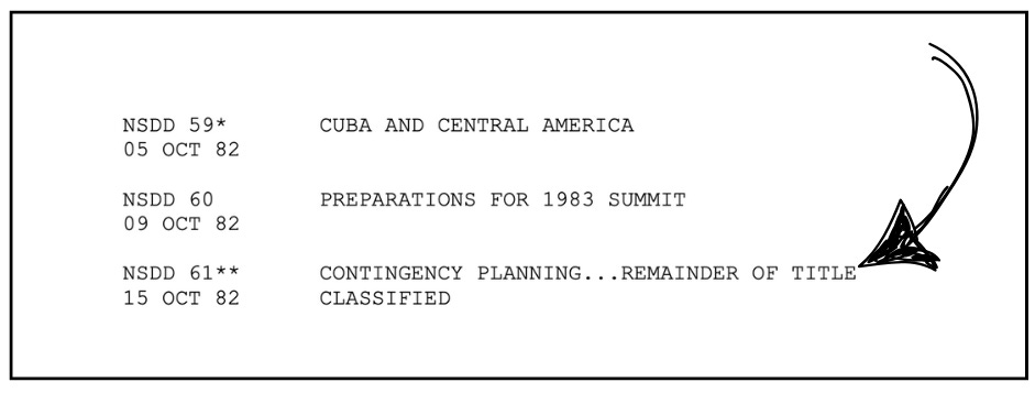 NSDD-61 (October 15, 1982): The most opaque. Ostensibly about NEACP aircraft, but potentially the keystone of a secret directive to intervene in Suriname.