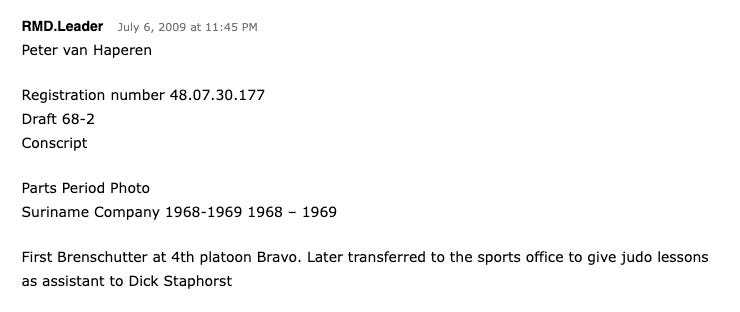 One of the most persistent claims in Peter van Haperen's narrative was his alleged service in Suriname's TRIS (Troepenmacht in Suriname, the Dutch forces stationed in Suriname) from 1968 to 1969. According to his account, he was initially a first machine gunner with the 4th platoon Bravo company before being transferred to the sports bureau to provide judo instruction as an assistant to Dick Staphorst. Some online commenters even provided what appeared to be a military registration number: 48.07.30.177 (which follows the format and approximate age of a TRIS man of Peter’s age).