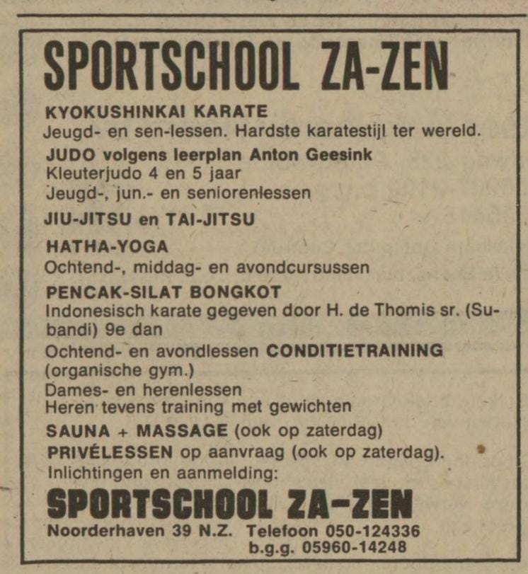 By 1978, advertisements show that "Sportschool Za-Zen," operated by Willem Bregonje, was located at Noorderhaven 39 NZ—the same address where van Haperen would later be documented as residing. This suggests that Za-Zen had been operating at this location for years before the 1982 legal notice involving van Haperen.
