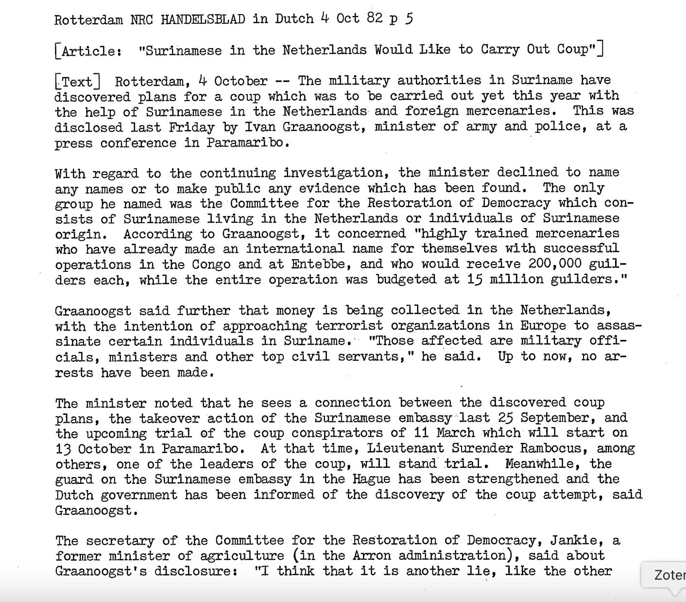 However, Haakmat's perspective evolved over time. In a telling twist, a newly uncovered newspaper article from July 1983 (two weeks after van Haperen's disappearance with the resistance funds) reveals that BVD officials personally visited Rudolf Jankie, chairman of the Foundation for Human Rights and Democracy in Suriname, asking if he knew van Haperen. When Jankie replied that he had never heard the name before, the BVD official told him that "the person behind this name is unreliable." This is particularly significant because Jankie was accused months earlier, in October of 1982 , of hiring terrorists and trying to orchestrate a coup before the end of the year—coinciding with the period when van Haperen claims to have been training the Brabant killers and having attended a dinner in Washington with William Casey, Carl Armfelt and others discussing such a coup.