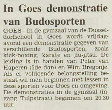 Remarkably, a newspaper clipping from November 1984—two years after their legal dispute— supports this, showing van Haperen and Bregonje working together again. The Provinciale Zeeuwse Courant reports that "Peter van Haperen (5th dan) and Wim Bregonje" would be giving martial arts demonstrations together in Goes. This revelation suggests that their relationship survived whatever financial and legal issues prompted the 1982 proceedings.